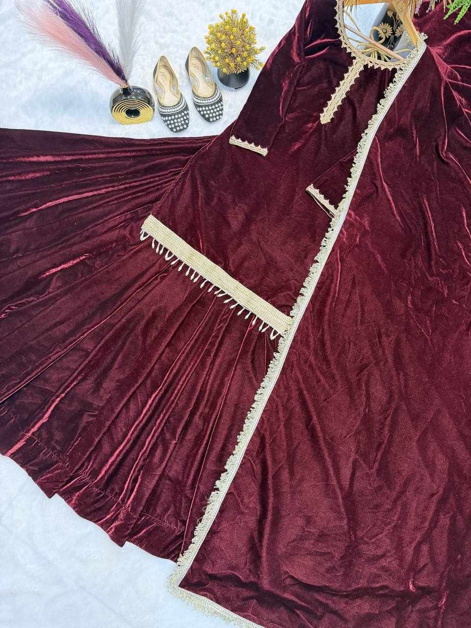 Fabric : Pure Heavy Viscose Velvet with Thread Work and Fancy Lace Sleeves