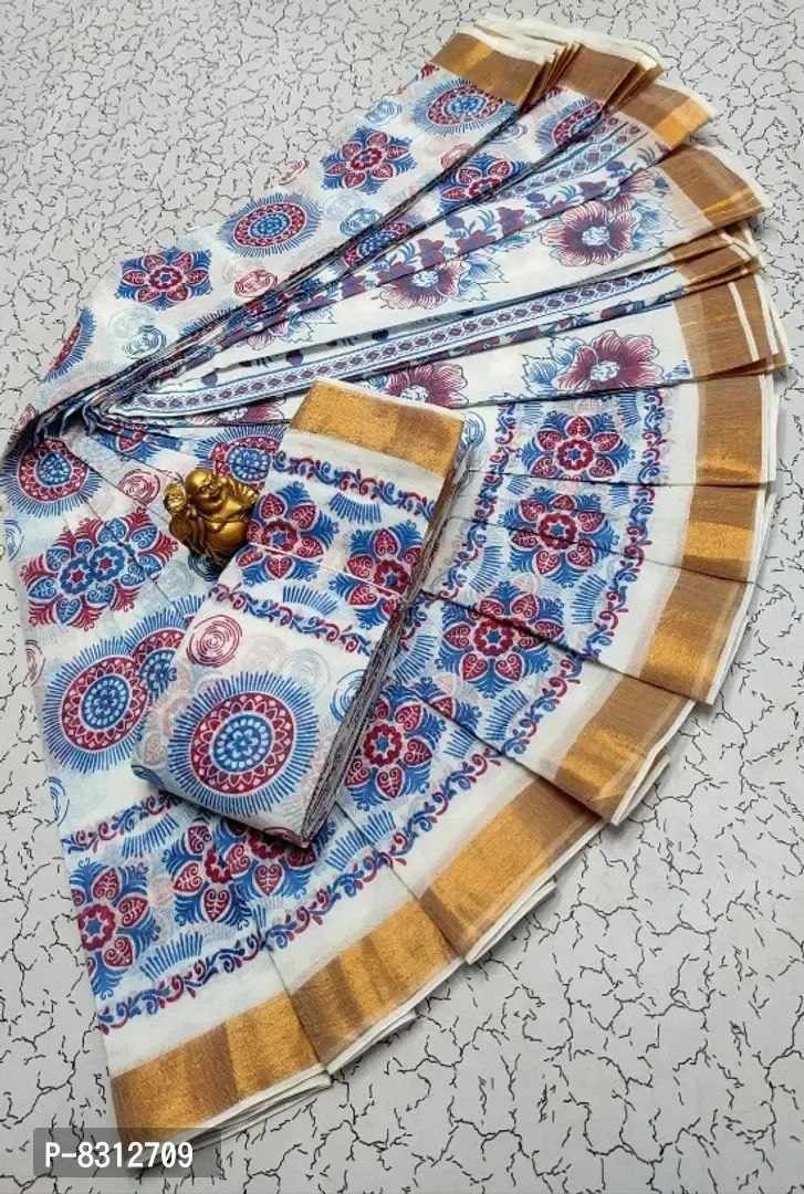 Home / Kerala Cotton Printed Zari Border Saree with Blouse Piece