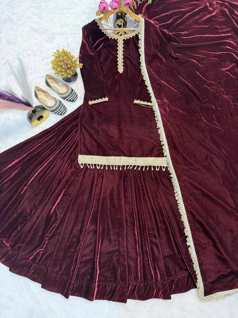 Fabric : Pure Heavy Viscose Velvet with Thread Work and Fancy Lace Sleeves