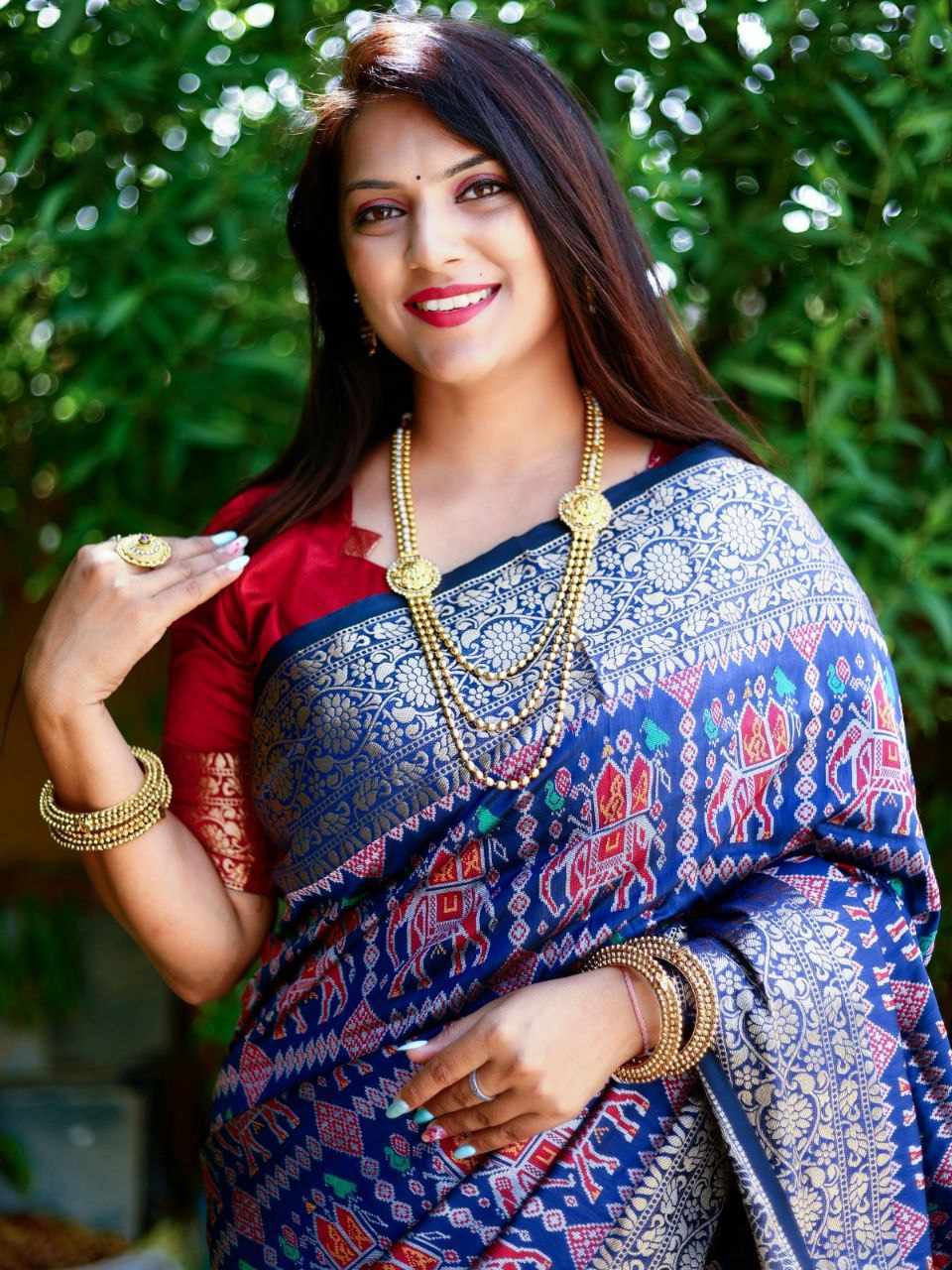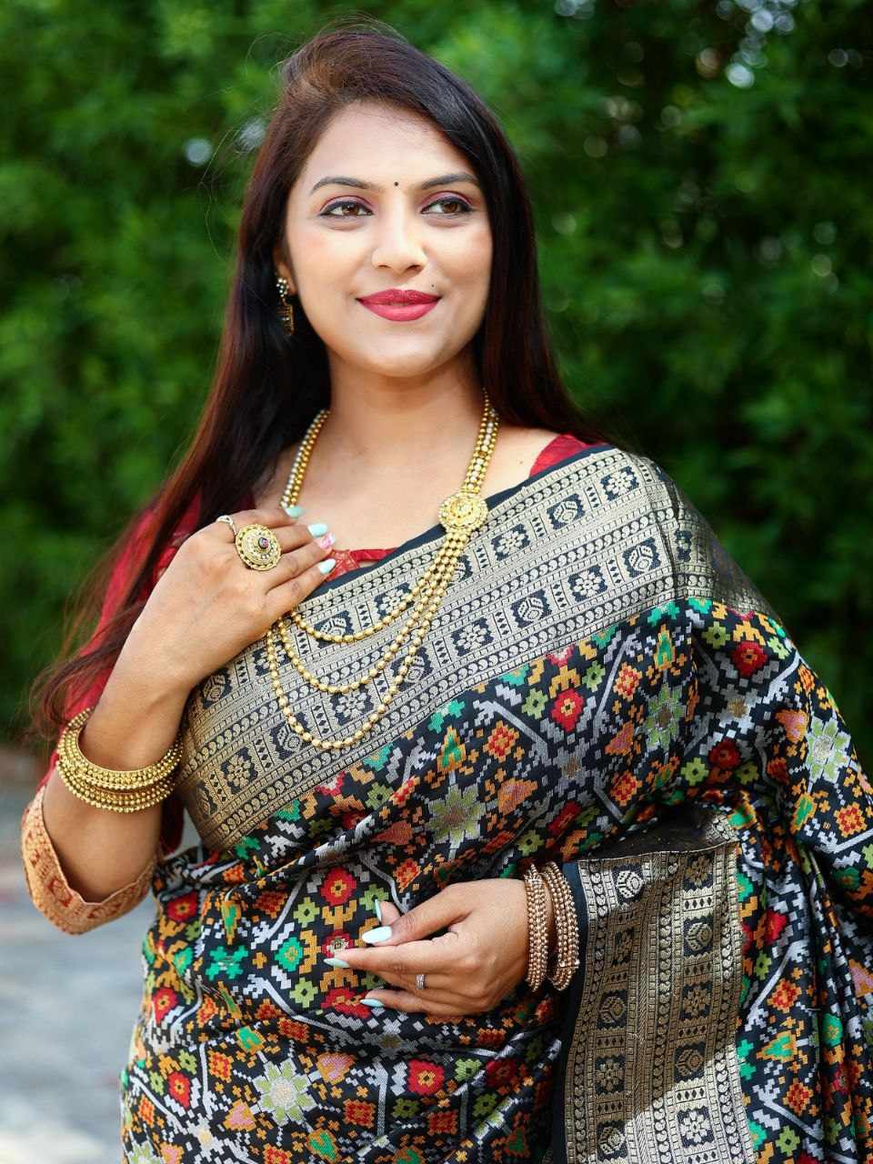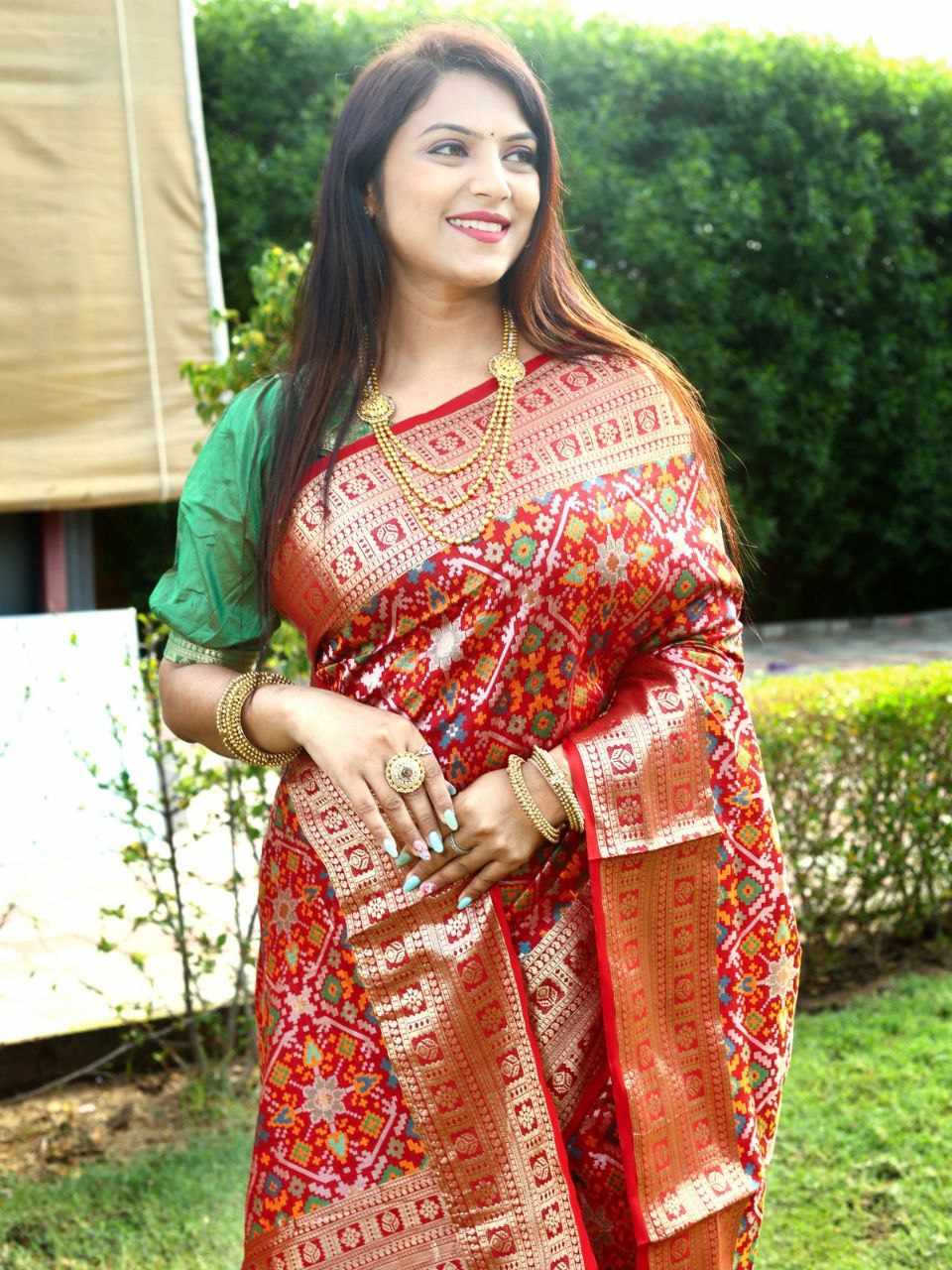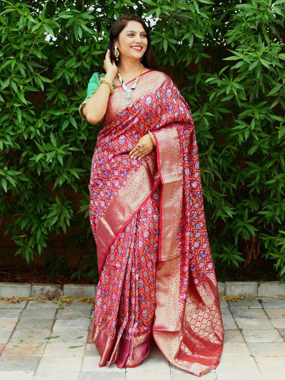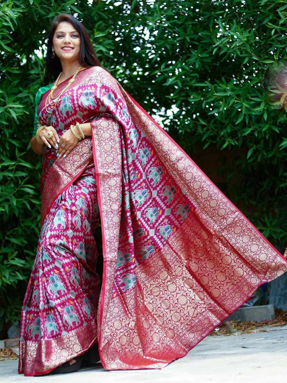 Saree has IKKAT Designed In All over zari Patola Weaving Concept with weaving Rich Pallu